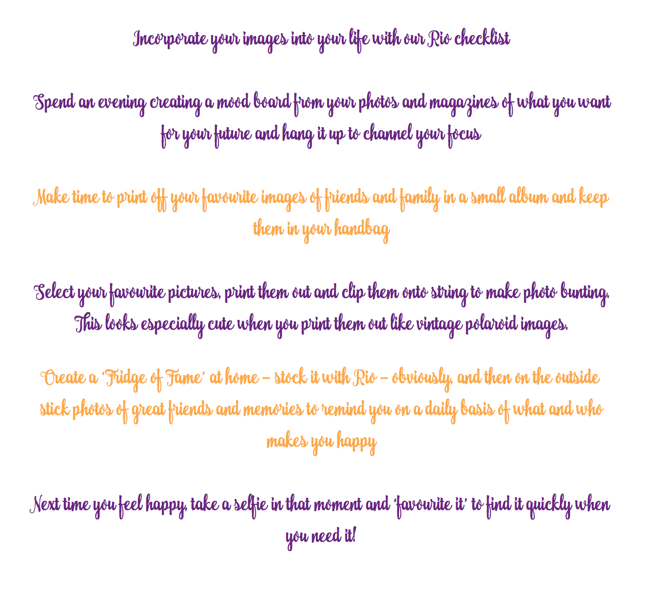 So if you want to actively make yourself feel happier, stop taking selfies for a moment and instead look through old photographs. You’ll find that seratonin is released in your brain when you do and you will naturally feel happier. But do it properly. Pour yourself a glass of Rio, sit down and go through your images. Then follow our steps above to ensure that you not only create selfies moving forwards, you surround yourself with memories …